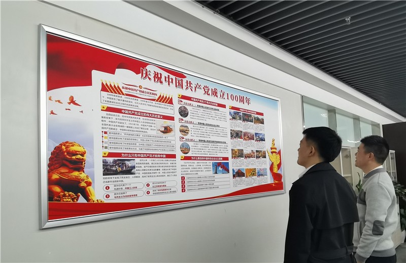 圖為辦公區(qū)黨史學(xué)習(xí)教育暨慶祝建黨100周年主題展板